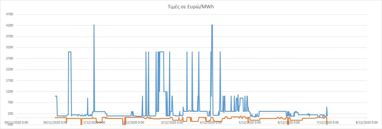 Στο παραπάνω γράφημα, φαίνονται στην μπλε γραμμή μέχρι που έφτασαν οι τιμές για την ανοδική εξισορρόπηση, δηλαδή το πόσο ζήτησαν και εισέπραξαν οι μονάδες φυσικού αερίου που παρέχουν την υπηρεσία αυτή όταν τους ζητείται να εγχύσουν παραπάνω ενέργεια από όση αρχικά είχε προγραμματιστεί και την είχαν προπληρωθεί στην προημερήσια αγορά.