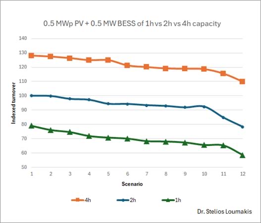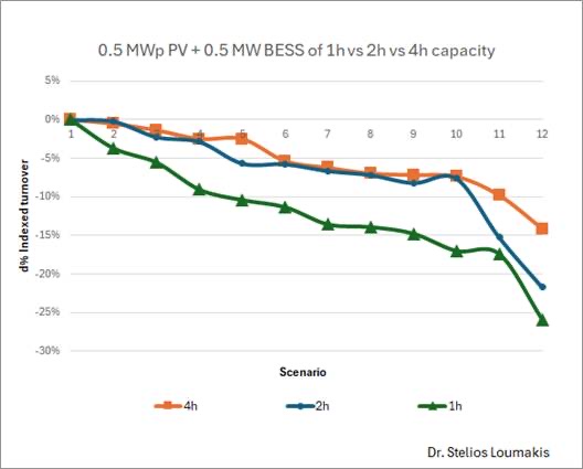 Επειδή μάλιστα, σε συνέχεια και της πρόσφατης συνάντησης στο Υπουργείο, υπήρξαν κάποιες προτάσεις για εξάλειψη του ελάχιστου ορίου της 1 ώρας χωρητικότητας που προβλέπει ο ν. 5261/2025 σχετικά με την προσθήκη μπαταριών behind the meter σε υφιστάμενα και νέα φωτοβολταϊκά πάρκα, στα διαγράμματα της μελέτης μας παρουσιάζονται συγκριτικά τρεις περιπτώσεις Φ/Β σταθμού merchant 500 kWp με μπαταρία χωρητικότητας 1 ώρας, 2 ωρών και 4 ωρών, για δώδεκα επιμέρους σενάρια market playing του σταθμού από τον ΦοΣΕ που θα το διαχειρίζεται στην αγορά. Το πρώτο διάγραμμα δείχνει σε indexed βάση τις διαφορές στο τζίρο, ενώ το δεύτερο την ποσοστιαία διακύμανση του ανά περίπτωση και αναλόγως της χρονικής ευστοχίας του ΦοΣΕ που θα το διαχειρίζεται, εν προκειμένω ως προς τις ώρες φόρτισης της μπαταρίας από το Φ/Β άρα και μη-έγχυσης του πάρκου στο δίκτυο, τις ώρες έγχυσης του Φ/Β απευθείας στο δίκτυο όταν η μπαταρία είναι γεμάτη και βεβαίως τις ώρες έγχυσης από την μπαταρία στο δίκτυο νωρίς το βράδυ που η ελεύθερη ζήτηση και οι τιμές κορυφώνονται.